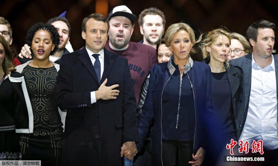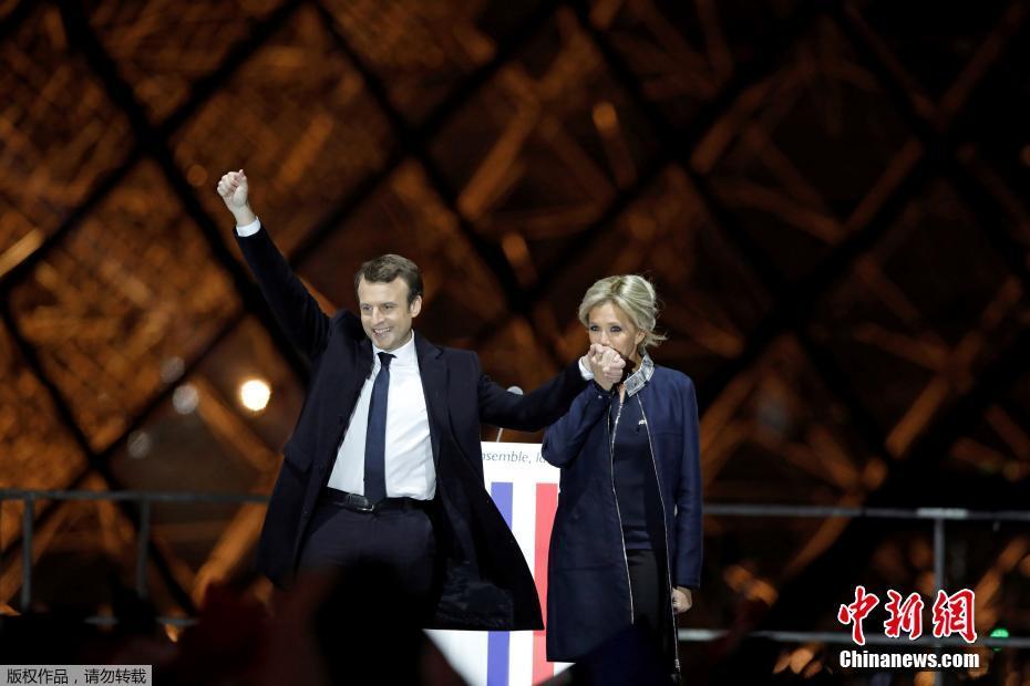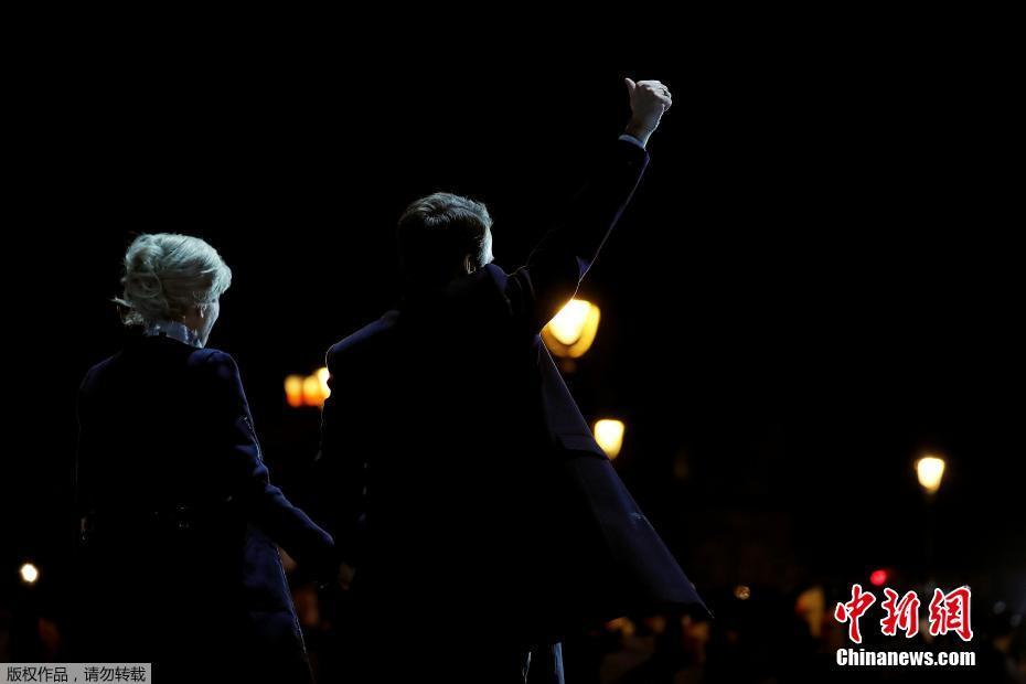 巴黎時(shí)間5月7日晚,法國總統(tǒng)選舉第二輪投票初步計(jì)票結(jié)果顯示,中間派獨(dú)立候選人、“前進(jìn)”運(yùn)動(dòng)領(lǐng)導(dǎo)人埃馬紐埃爾·馬克龍以大幅優(yōu)勢(shì)擊敗極右翼政黨“國民陣線”候選人馬麗娜·勒龐。年僅39歲的馬克龍由此成為法國史上最年輕的總統(tǒng),也成為世界上最年輕的大國領(lǐng)導(dǎo)人。圖為馬克龍(左二)和妻子布麗吉特(右二)在慶祝勝選的集會(huì)上向支持者致意。中新社記者 龍劍武 攝