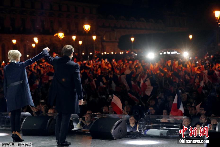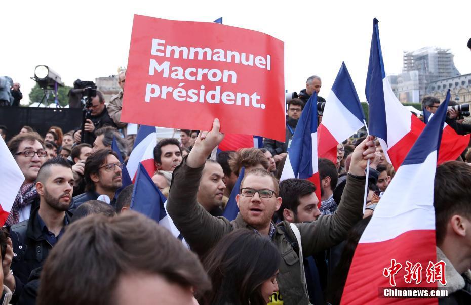 巴黎時(shí)間5月7日晚,法國總統(tǒng)選舉第二輪投票初步計(jì)票結(jié)果顯示,中間派獨(dú)立候選人、“前進(jìn)”運(yùn)動(dòng)領(lǐng)導(dǎo)人埃馬紐埃爾·馬克龍以大幅優(yōu)勢(shì)擊敗極右翼政黨“國民陣線”候選人馬麗娜·勒龐。年僅39歲的馬克龍由此成為法國史上最年輕的總統(tǒng),也成為世界上最年輕的大國領(lǐng)導(dǎo)人。圖為馬克龍的支持者在得知馬克龍當(dāng)選后歡呼。中新社記者 龍劍武 攝
