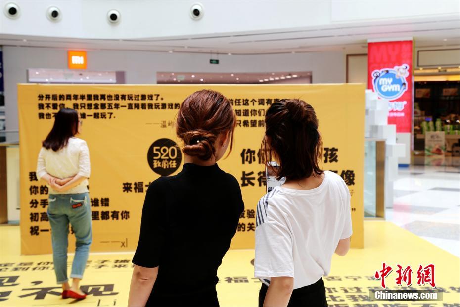 5月18日,在浙江寧波某商場(chǎng)內(nèi),近百條“致前任”留言貼滿了墻壁和地面,引發(fā)不少市民駐留圍觀。據(jù)工作人員介紹,這些句子來自網(wǎng)絡(luò)征集,最終篩選了99名網(wǎng)友留言,希望在“520”這一網(wǎng)絡(luò)情人節(jié)中,引發(fā)人們對(duì)愛的共鳴。尤勤勇 攝