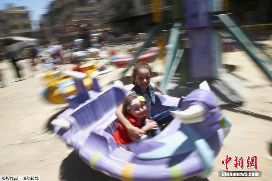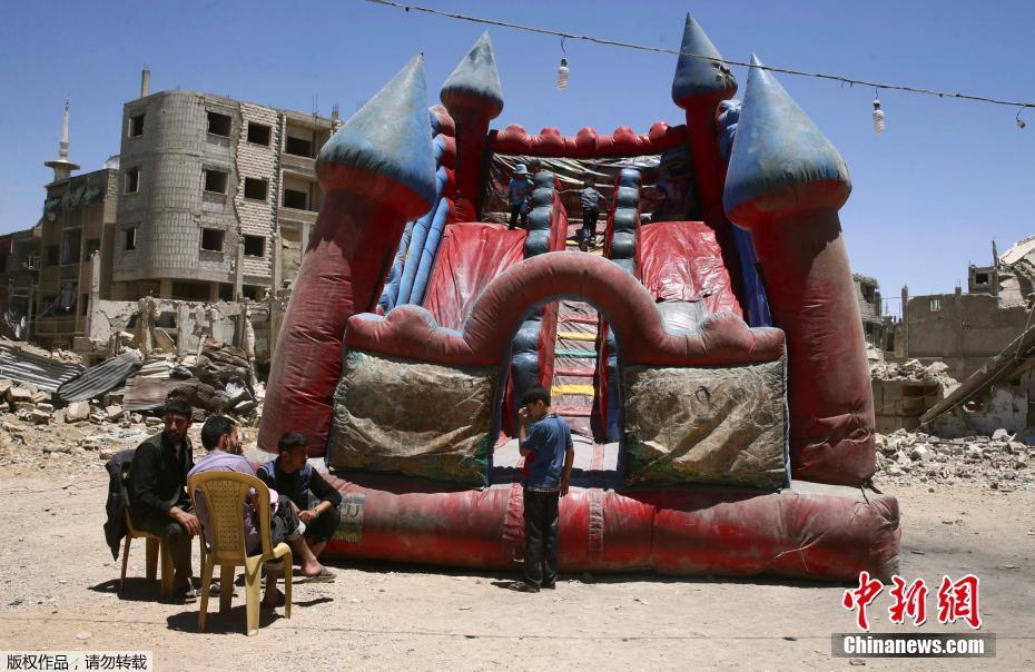 當(dāng)?shù)貢r(shí)間2017年6月26日,敘利亞反對(duì)派控制區(qū)杜馬,兒童在臨時(shí)的游樂(lè)園玩玩耍慶祝開(kāi)齋節(jié)。