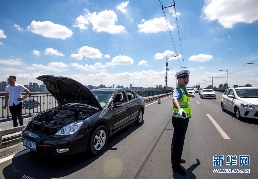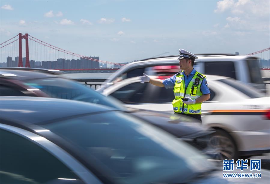 7月19日,武漢大橋大隊(duì)交警劉升在橋面上疏導(dǎo)交通。