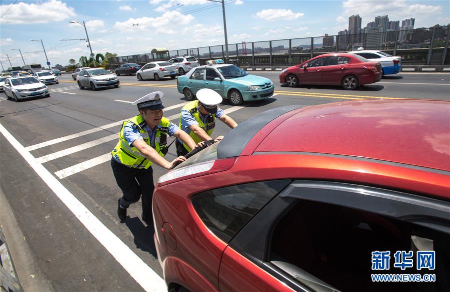 7月19日,武漢大橋大隊(duì)交警劉升(左)與同事一起將拋錨車輛推離橋面。