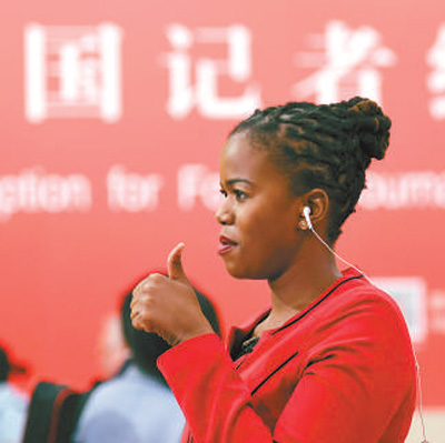 外國記者在十九大新聞中心進(jìn)行現(xiàn)場連線報道。 本報記者 雷 聲攝