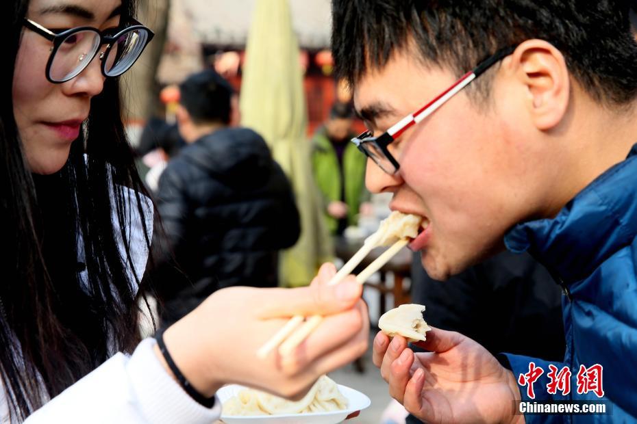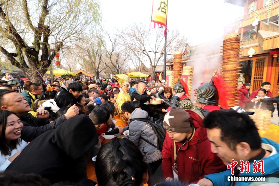 2018年1月1日,河南開封清明上河園孫羊正店門前,現(xiàn)場高高疊起的小籠包熱氣騰騰,小籠包上喜慶的紅字寫著“2018”“蒸蒸日上”?!八位兆凇睅ьI(lǐng)“后宮佳麗”為游客免費發(fā)放剛剛蒸好的小籠包,寓意新的一年“蒸蒸日上”,吸引數(shù)千名游客爭相品嘗求好運。據(jù)清明上河園市場部石經(jīng)理介紹,為了給游客送上這份新年祝福,清明上河園啟用了多個地方一起蒸小籠包,當(dāng)天共準(zhǔn)備了2018籠開封名吃“灌湯包”,在多個發(fā)放點陸續(xù)為民眾送上新年的“免費午餐”,祝愿大家都能夠在新的一年里“蒸蒸日上”。中新社記者 王中舉 攝