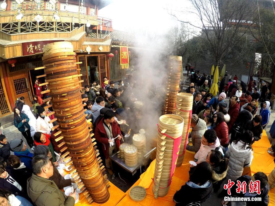 2018年1月1日,河南開封清明上河園孫羊正店門前,現(xiàn)場高高疊起的小籠包熱氣騰騰,小籠包上喜慶的紅字寫著“2018”“蒸蒸日上”。“宋徽宗”帶領(lǐng)“后宮佳麗”為游客免費發(fā)放剛剛蒸好的小籠包,寓意新的一年“蒸蒸日上”,吸引數(shù)千名游客爭相品嘗求好運。據(jù)清明上河園市場部石經(jīng)理介紹,為了給游客送上這份新年祝福,清明上河園啟用了多個地方一起蒸小籠包,當(dāng)天共準(zhǔn)備了2018籠開封名吃“灌湯包”,在多個發(fā)放點陸續(xù)為民眾送上新年的“免費午餐”,祝愿大家都能夠在新的一年里“蒸蒸日上”。中新社記者 王中舉 攝