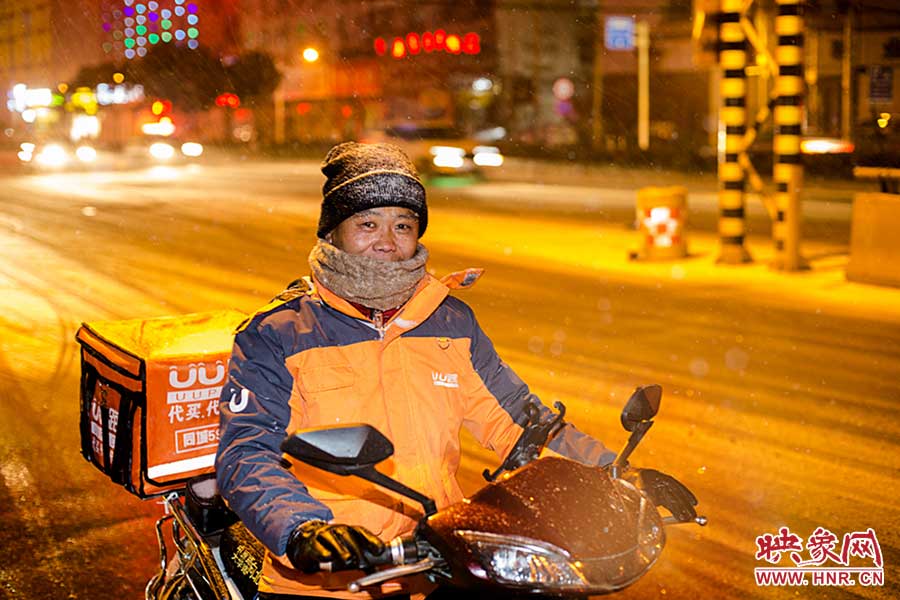 一位跑腿師傅剛從四環(huán)送貨回來,眉毛上都落上了雪花