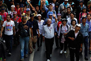 5月9日,泰國反政府示威者在素帖(中)的領(lǐng)導(dǎo)下在曼谷市中心游行。
