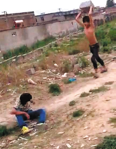 視頻顯示,6分45秒時(shí),一名打人者搬起一塊石頭,向少年背部砸去。隨后,該男子再次搬起石塊,向后走幾米遠(yuǎn),舉起石塊朝少年頭上砸。少年當(dāng)場昏厥,打人者則對著少年臉部撒尿。