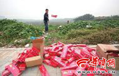 昨日下午,西安市雁翔路附近的一塊荒地里,上百條中華牌香煙和少量的蘇煙散落在草叢和垃圾堆里。這些香煙大多包裝完整,有防偽噴碼,看上去和市面上出售的商品一模一樣。有人說,這些高檔煙是前一天下午一輛面包車開過來扔的。