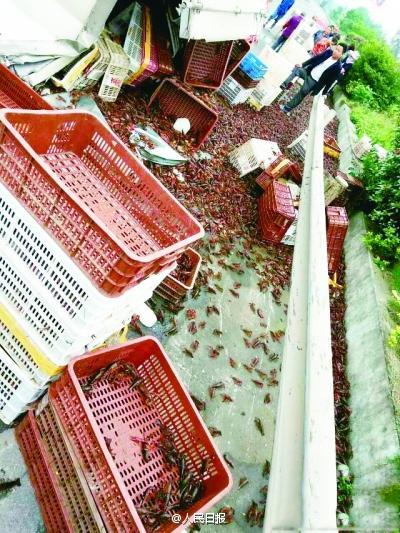 本報(bào)訊(記者魏娜 通訊員徐文匯)昨日中午,1輛滿載小龍蝦的貨車在漢宜高速上側(cè)翻,2000余公斤小龍蝦撒了一地。高速公路附近的村民聞?dòng)嵹s來,拿著蛇皮袋、竹筐搶小龍蝦,車?yán)习寮绷?,攔住這個(gè)、跑了那個(gè),手忙腳亂。高速交警和派出所民警及時(shí)趕來控制現(xiàn)場(chǎng),保住大半的小龍蝦。