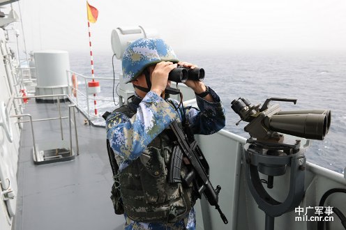 3月21日,海軍第十一護航編隊首次獨立執(zhí)行護航任務?!扒鄭u”艦警戒哨正在觀察海面情況。米晉國攝影