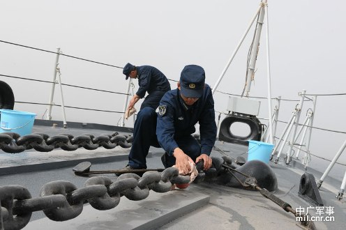 3月21日,海軍第十一護航編隊首次獨立執(zhí)行護航任務。受沙塵暴影響,能見度降低。圖為“青島”艦官兵在清潔掃除。米晉國攝影