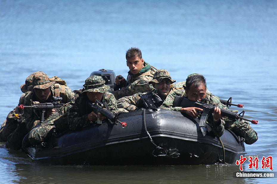 4月25日,美國(guó)與菲律賓“肩并肩2012”聯(lián)合軍演參演部隊(duì)在菲律賓南部巴拉望省普林塞薩港市的阿魯甘灣舉行“兩棲登陸”演練,美菲雙方近百名海軍陸戰(zhàn)隊(duì)士兵參加。這也是美菲“肩并肩2012”聯(lián)合軍演開(kāi)幕10天以來(lái),開(kāi)放媒體采訪規(guī)模最大的一場(chǎng)軍事演習(xí)活動(dòng)。圖為美菲海軍陸戰(zhàn)隊(duì)士兵混合編隊(duì),搭乘小艇抵達(dá)演習(xí)地點(diǎn)。張明 攝