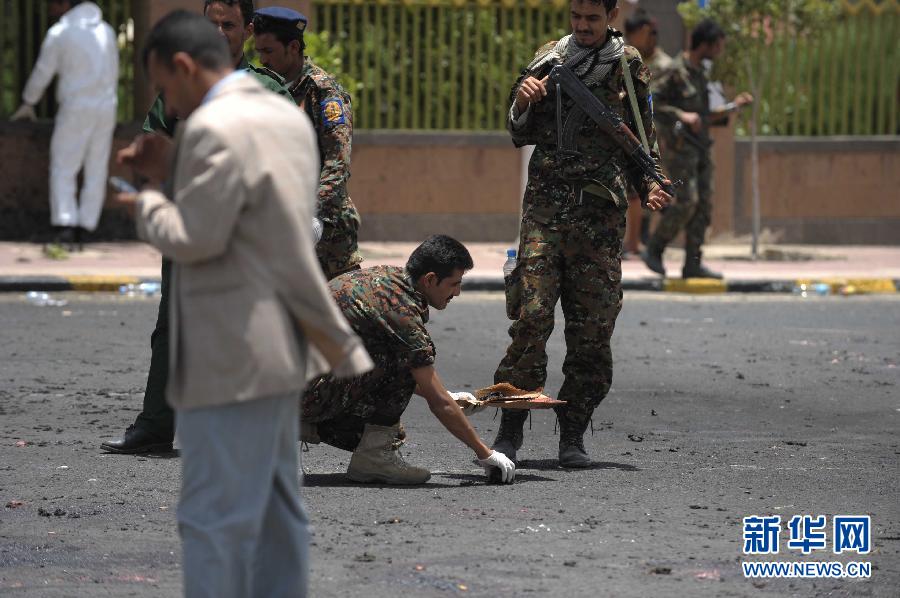 5月21日,在也門首都薩那,也門安全部隊人員在爆炸現(xiàn)場清理殘骸。