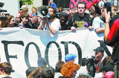 5月21日,一名“占領(lǐng)芝加哥”活動(dòng)的抗議者在“要食物不要炸彈”的橫幅前發(fā)表反戰(zhàn)演講。當(dāng)日,近千名抗議者在美國(guó)總統(tǒng)奧巴馬的競(jìng)選總部大樓外進(jìn)行示威活動(dòng),要求奧巴馬政府和北約立即停止戰(zhàn)爭(zhēng)。新華社記者 張保平攝