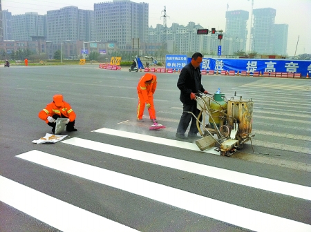 3月29日上午10時許,在金水東路與東風東路交叉口,工人們正在對該路口的斑馬線重新噴漆(如圖)。“新標線施劃完5分鐘即可通行”,現(xiàn)場的工人說。
