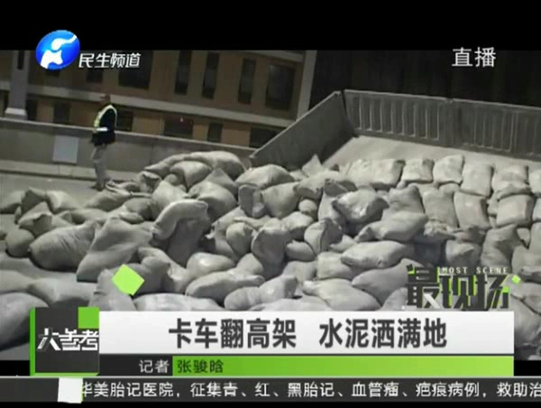 卡車(chē)偷上高架側(cè)翻 水泥撒一地