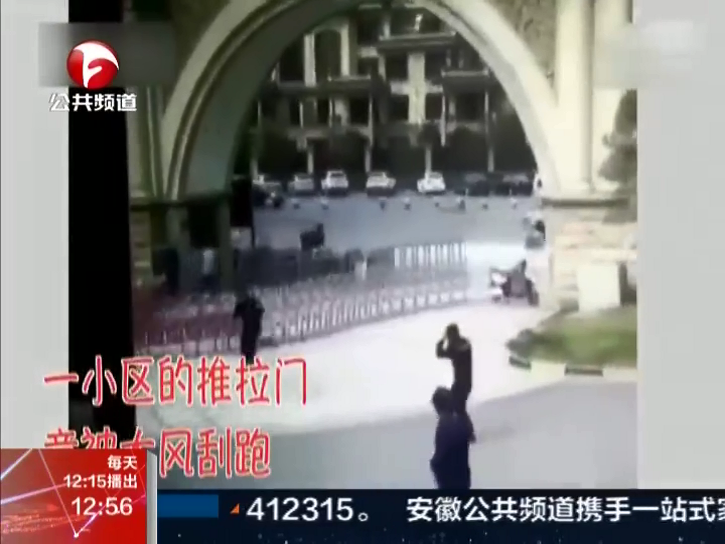 小區(qū)大門被風(fēng)吹跑 保安緊追