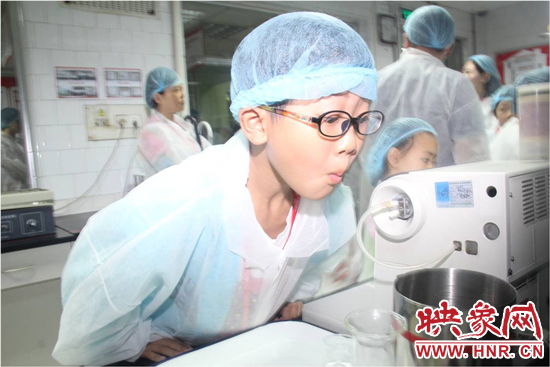 穿上白色的參觀服、戴上一次性帽子,受邀家庭進入了檢測區(qū),參觀了質(zhì)量控制的檢測工作流程。正在工作的品控員,現(xiàn)場邀請了一名小朋友進行了其中一項檢測--白利度檢測。“簡單來講,就是利用密度儀,測試一瓶飲料的糖度和含氣量兩個指標(biāo)?!逼房貑T張青介紹道。