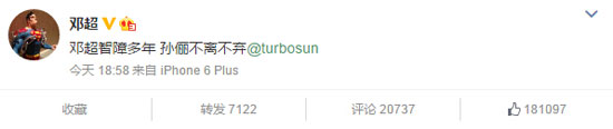 2015年3月30日,鄧超發(fā)表微博稱:“鄧超智障多年,孫儷不離不棄?!标P(guān)心孫儷和鄧超二人的網(wǎng)友們瞬間圍觀。網(wǎng)友們徹底被鄧超這個(gè)段子手所打敗了:“說的好有道理,我竟無言以對(duì)?!?/p>