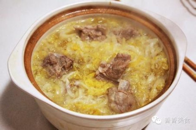 1、先將排骨過(guò)開(kāi)水燙去血沫。買(mǎi)來(lái)的酸菜切小塊,將酸菜的厚幫子片成薄片,在冷水中浸泡一會(huì)兒。蔥姜切沫。