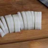 2. 切成1CM左右的厚片,再切開成2片或4片。