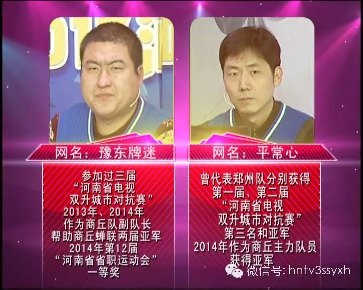對(duì)陣選手來(lái)頭也是不小,戰(zhàn)績(jī)顯赫。豫東牌迷來(lái)自商丘,商丘隊(duì)副隊(duì)長(zhǎng),曾參加過(guò)三屆城市對(duì)抗賽,2013、2014年作為商丘隊(duì)主力隊(duì)員幫助商丘蟬聯(lián)兩屆亞軍,2014年第12界河南省省職運(yùn)動(dòng)會(huì)一等獎(jiǎng)平常心曾代表鄭州隊(duì)獲得第一屆城市對(duì)抗賽第三名,第二屆城市對(duì)抗賽亞軍,2014年的作為商丘主力獲得亞軍