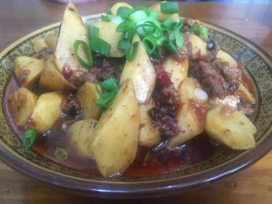 3.炒制。將肉餡加料頭炒香,加入干紅辣椒,花椒,花椒面,豆瓣醬和老干媽醬炒香,加水后放入山藥,加鹽,白糖,蠔油,甜面醬調(diào)味。