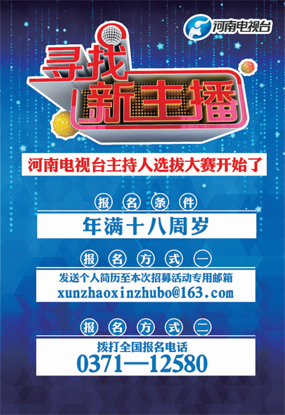 10月1日起,河南電視臺(tái)將啟動(dòng)“尋找新主播”活動(dòng)。這是由河南電視臺(tái)都市頻道承辦的一檔大型主持人選拔活動(dòng),選拔范圍輻射全國(guó),無論你在哪里,無論你正在從事哪個(gè)行業(yè),只要您年滿18周歲,沒準(zhǔn)兒下一個(gè)“新主播”就是你!