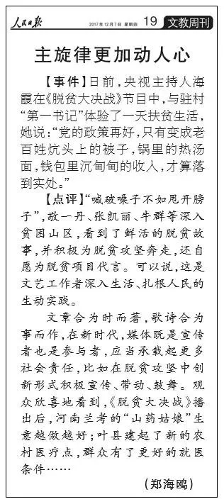 評(píng)論中還指出,文章合為時(shí)而著,歌詩合為事而作,在新時(shí)代,媒體既是宣傳者也是參與者,應(yīng)當(dāng)承載起更多社會(huì)責(zé)任,比如在脫貧攻堅(jiān)中創(chuàng)新形式積極宣傳、帶動(dòng)、鼓舞。觀眾欣喜地看到,《脫貧大決戰(zhàn)》播出后,河南蘭考的“山藥姑娘”生意越做越好;葉縣建起了新的農(nóng)村醫(yī)療點(diǎn),群眾有了更好的就醫(yī)條件……