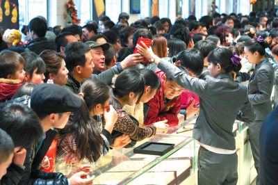 昨天,市民在菜百挑選黃金飾品。當(dāng)天是新年第一天,北京各大金店出現(xiàn)消費者囤金迎新的火爆場景。其中,菜百各分店全天銷售額達到兩億元;中國黃金蔣宅口旗艦店投資金銷售超過150公斤。京華時報記者蒲東峰攝