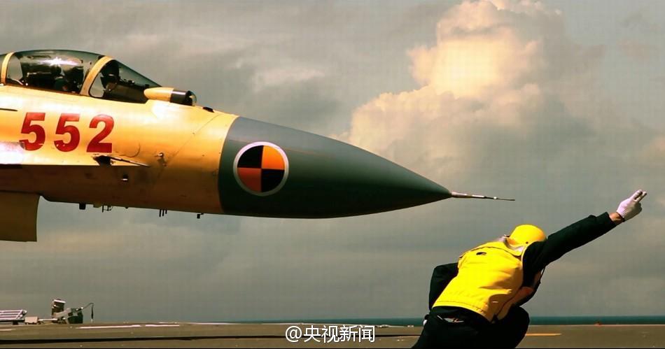 昨天,央視新聞首先在節(jié)目中播出這一視頻。視頻配以恢宏的音樂,記錄了殲15艦載機(jī)在遼寧艦上起飛、著艦的畫面。視頻以飛行員的日?;居?xùn)練作為開頭,描述了飛行員做起飛前的準(zhǔn)備工作、飛行中駕駛飛機(jī)及著陸的狀態(tài)。值得注意的是,視頻中,還有近10秒時(shí)間展示了殲15在空中進(jìn)行特技飛行動(dòng)作的畫面,飛行員駕駛飛機(jī)進(jìn)行翻轉(zhuǎn),畫面中天空與地面的位置調(diào)轉(zhuǎn)。