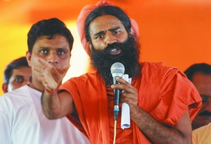 3日,新德里,計劃發(fā)起反腐敗絕食抗議行動的印度瑜伽大師拉姆德夫(右)向支持者講話。