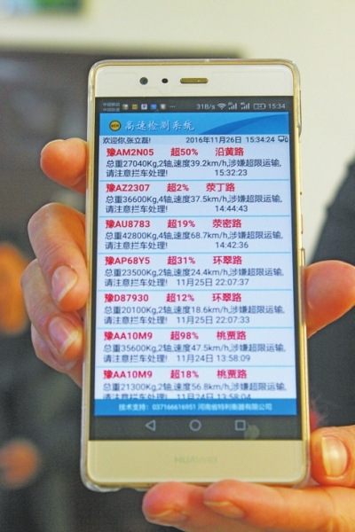11月28日下午2時許,在滎陽市桃賈路樓李段,執(zhí)法人員將一輛大卡車攔截下來,當即作出處罰決定,依據(jù)的是大卡車駛過樓李路面動態(tài)稱重檢測系統(tǒng)和監(jiān)控攝像頭時,系統(tǒng)顯示該大卡車超載36%,其超載信息通過監(jiān)控裝置實時傳輸?shù)街登诮痪氖謾C中。