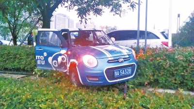 昨日上午10時許,大河報記者跟著鄭州市公安局交巡警支隊直屬六大隊民警,來到鄭東新區(qū)CBD如意湖畔的千璽廣場。事故發(fā)生地點位于千璽廣場西南側的一處廣場上,這里有一處共享汽車停車場。記者發(fā)現(xiàn),這里共有6輛共享汽車,出事的豫A5A32B共享汽車是一輛藍白色搭配的力帆汽車,停在綠化帶內,車身有碰撞痕跡。停車場東北角,一輛白色豫A牌照奔馳轎車左前臉位置受損。