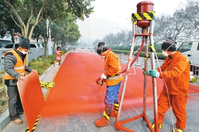 “機動車道6米寬,鋪設‘綠道’的自行車道也為6米寬??磻T了灰黑色的路面,在看到色彩明銳的‘綠道’后肯定覺得眼前一亮?!G道’只是叫法,并不是說道路外觀一定是綠色的,在景觀設計中,‘綠道’往往有著更深更廣的內(nèi)涵?!惫こ特撠熑藚蜗壬嬖V記者,彩色瀝青厚度僅為1到2毫米,壽命在5年以上,具有警示、防滑、降噪、美觀等特點?!拔覈G道’通常以警示色紅色為主打,主要作用是打造人車分離模式,供騎車者和步行者休閑使用?!?/p>