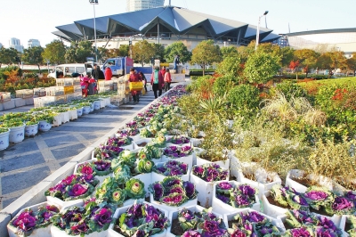“嘿,快看,真美!感覺好像瞬間穿越到了絢麗多彩的春季!”昨日中午,在鄭東新區(qū)CBD商務內(nèi)環(huán),幾名市民指著花壇內(nèi)一大片黃、紅、紫三色相間的鮮花說。在這里,記者看到一撥撥工作人員正忙著將一盆盆鮮花擺放到預先設置好的花架上。姿態(tài)秀逸、枝葉扶蘇,綴滿鮮艷奪目紅果的南天竹十分吸睛;各種色彩亮麗的花朵,則為冬日的鄭州增添了一抹迷人的色彩;株形如牡丹,葉片形態(tài)美觀多變,觀賞性不輸鮮花的甘藍更是隨處可見。